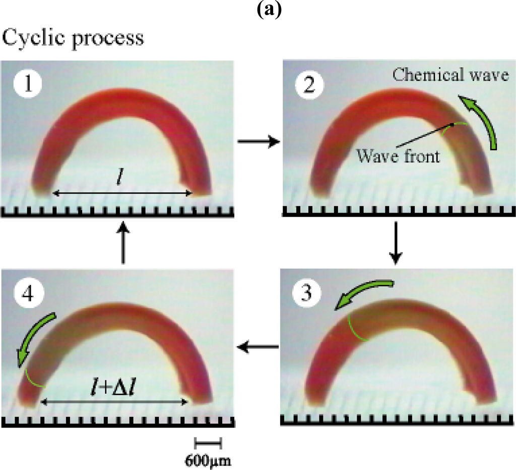 However, these systems require complex and fabricated circuits or external control devices because the resulting mechanical motion is driven by on–off switching of external signals. On the other hand, in biological systems, there are several autonomic phenomena exhibiting spontaneous motion without any external stimuli such as peristaltic motion, self-oscillation, etc. If such a system is to be achieved in an artificial system, a novel actuation device that does not depend on external control would be expected. Thus, devices mirroring living organisms could be created without electronic wiring. There are currently only a few reports of the incorporation of such autonomous devices into artificial systems. As an attempt using cardiac muscle cells and synthetic polymers, Whitesides and co-workers have demonstrated a self-walking bioactuator [14]. Although utilization of biopolymer or cell system is one possible way, our aim is to realize a completely artificial system.