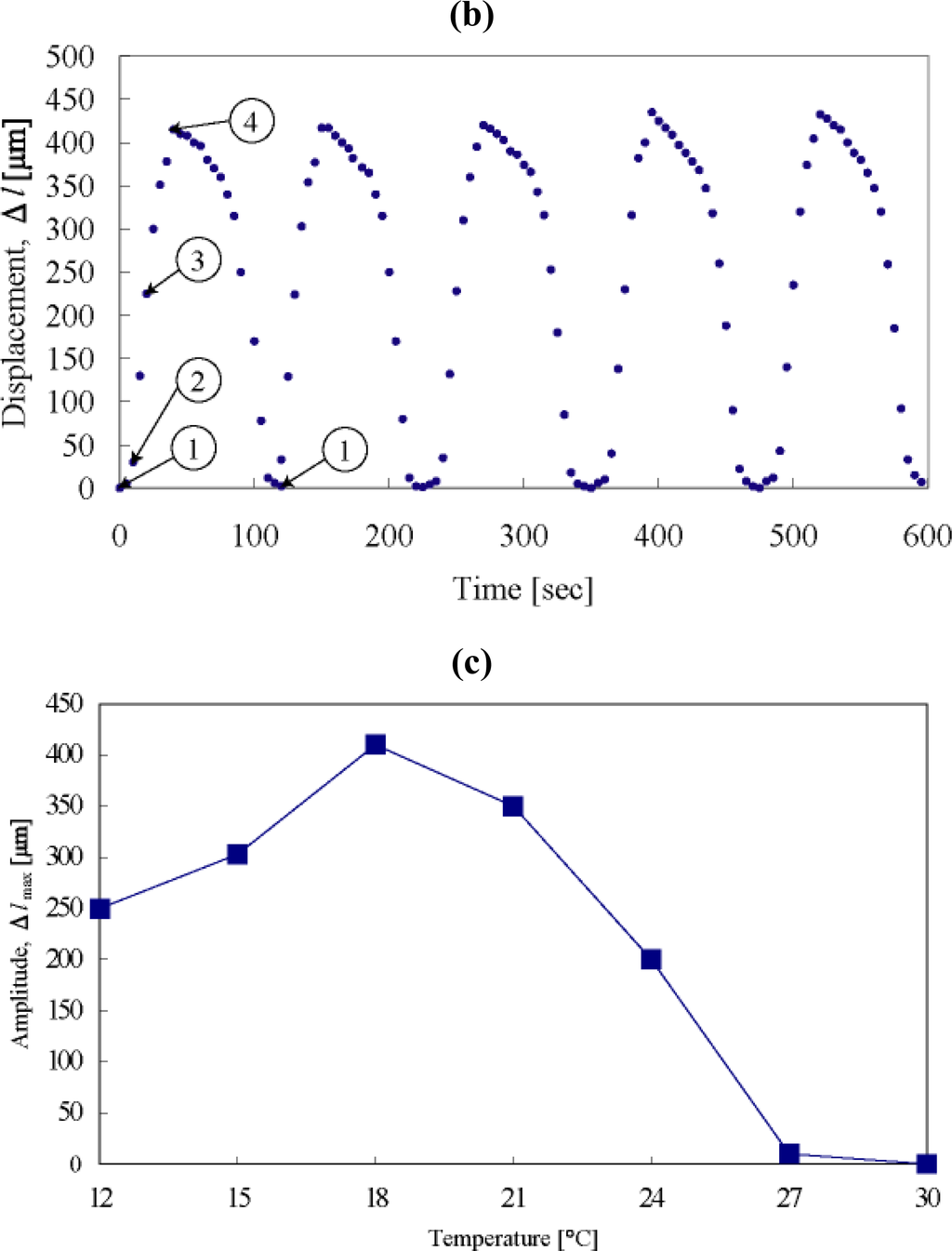 Figure 4(a) shows the cyclic changes of bending-stretching motion of the gel strip in an aqueous solution containing the three reactants of the BZ reaction (malonic acid, sodium bromate and nitric acid) at constant temperatures. Since the gel size is larger than chemical wavelength, homogeneous redox changes induced forcedly by using the oxidizing and reducing agents as shown in Figure 2 do not occur. The chemical wave evolves in the gel, and it propagates in the direction of the length at constant speed from one edge attaching the substrate to the other edge. With the propagation of the chemical wave, the distance between the two edges of the gel changes periodically because the spontaneous bending and stretching motion occurs [Figure 4(b)]. While the chemical wave exists in the gel (1→4), the gel stretches. After that, during the reduced state until the next wave appears (4→1), the gel bends. As shown in Figure 4(c), the amplitude of the mechanical oscillation (Δlmax) changes with temperature because the difference in swelling ratio between reduced state and oxidized state depends on temperature (c.f. Figure 3). We can see that there is the optimum temperature (18 °C) at which the amplitude becomes the maximum. This temperature does not necessarily coincide with the optimum temperature estimated from Figure 3. This is because Figure 3 indicates the comparison of equilibrium redox states in different solutions from the BZ substrate solution. And also, in the case of Figure 4(c), the oscillation period changes with temperature, which affects the dynamic process of mechanical oscillation. Anyway, the following experiment was conducted at 18 °C.