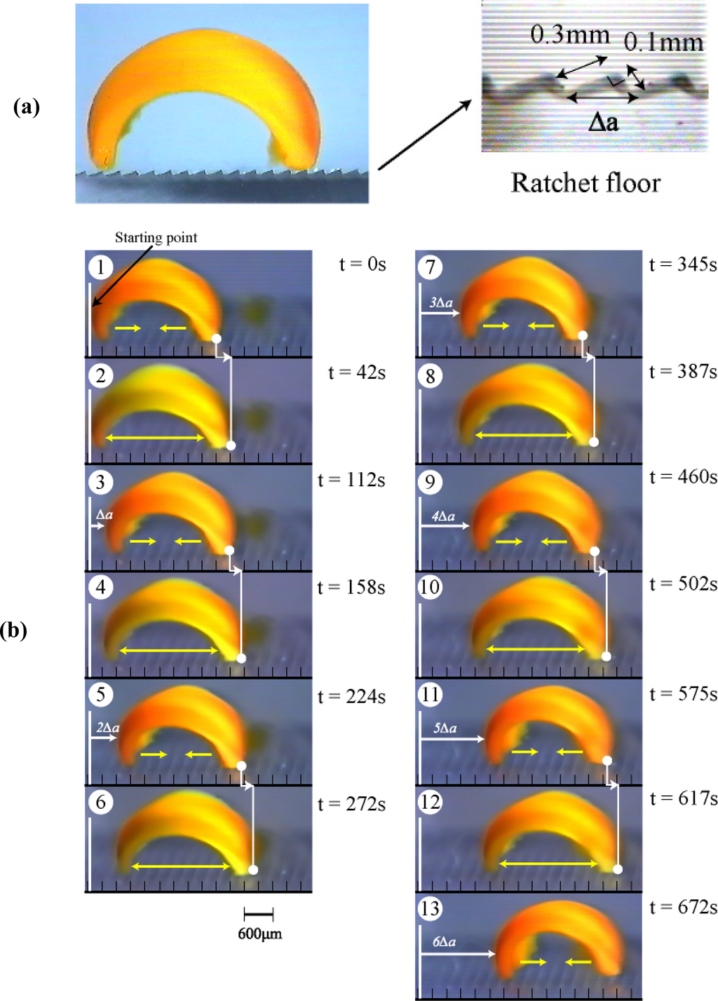 (a) Surface structure of the ratchet floor made of acrylic sheet. Δa stands for the interval of the ratchet teeth. (b) Time course of self-walking motion of the gel actuator (odd number: bending process at the reduced state, even number: stretching process with propagation of chemical wave). During stretching process, the front edge can slide forward on the floor, but the rear edge is prevented from sliding backwards. Oppositely, during bending process, the front edge is prevented from backwards while the rear edge can slide forward. This action is repeated spontaneously, and as a result, the gel walks forward. In one period of the oscillation, the gel can take a step forward by Δa. Outer solution: 62.5 mM malonic acid, 84 mM sodium bromate, 0.894 M nitric acid, 18 °C. Reproduced from [25].