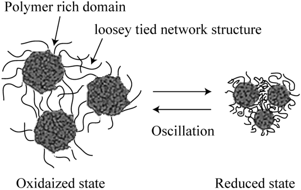where Dc is the diffusion coefficient of the polymer gel. If Dc has a high value, the response of the gel is fast, as shown in Equation (2). In general, the degree of the response of hydro gels composed of chemically cross-linked polymer networks is low because the polymer chains are molecularly restricted by a large number of cross-links. There are remarkable difference of swelling ratio between the reduced Ru(II) state and oxidized Ru(III) state in the poly[NIPAAm-co-Ru(bpy)3] gel at the equilibrium swelling state. But actually, the volume oscillation coupled with the redox oscillation of the ruthenium catalyst moiety due to the BZ reaction is very small. The rate of the redox reaction of the Ru moiety is significantly faster than that of swelling-deswelling of the gel in the equilibrium condition such as above mentioned. Therefore, the poly[NIPAAm-co-Ru(bpy)3] self-oscillating gel generated the small mechanical oscillation. In order to produce the large mechanical oscillation in comparison with the gel size, the self-oscillating gel has to response firstly to the rate of the BZ reaction. For realizing this purpose, we prepared the microphase-separated self-oscillating gel. That is because that, in the previous work, it was reported that the NIPAAm gel with micro scale phase separation underwent quick response [31]. By preparing NIPAAm gel above the lower critical solution temperature (LCST), the network structure becomes inhomogeneity due to the LCST nature of the NIPAAm component. As a result, the NIPAAm gel forms a porous structure that consists of two regions: one is polymer rich domains, and the other is aggregations in the matrix of a loosely tied network structure. Consequently, rich domains inside the gel clump or loose rapidly because of an effluent pathway of water due to the porous structure, as shown in Figure 6. However, the micro phase separation in the gel strongly depends on the methods of gel preparation. Therefore, the control of the phase separation was too difficult by selecting the synthesis temperature. In order to control the micro scale phase separation into the self-oscillating gel, we synthesized the gel under the water-methanol mixture solution by utilizing the hydrophobic casting mold. Generally, in the mixed solvent of water and methanol, the LCST of aqueous PNIPAM solutions shifts to lower temperature [32,33]. So, it is assumed that the micro phase separated structure was introduced inside the gel.
