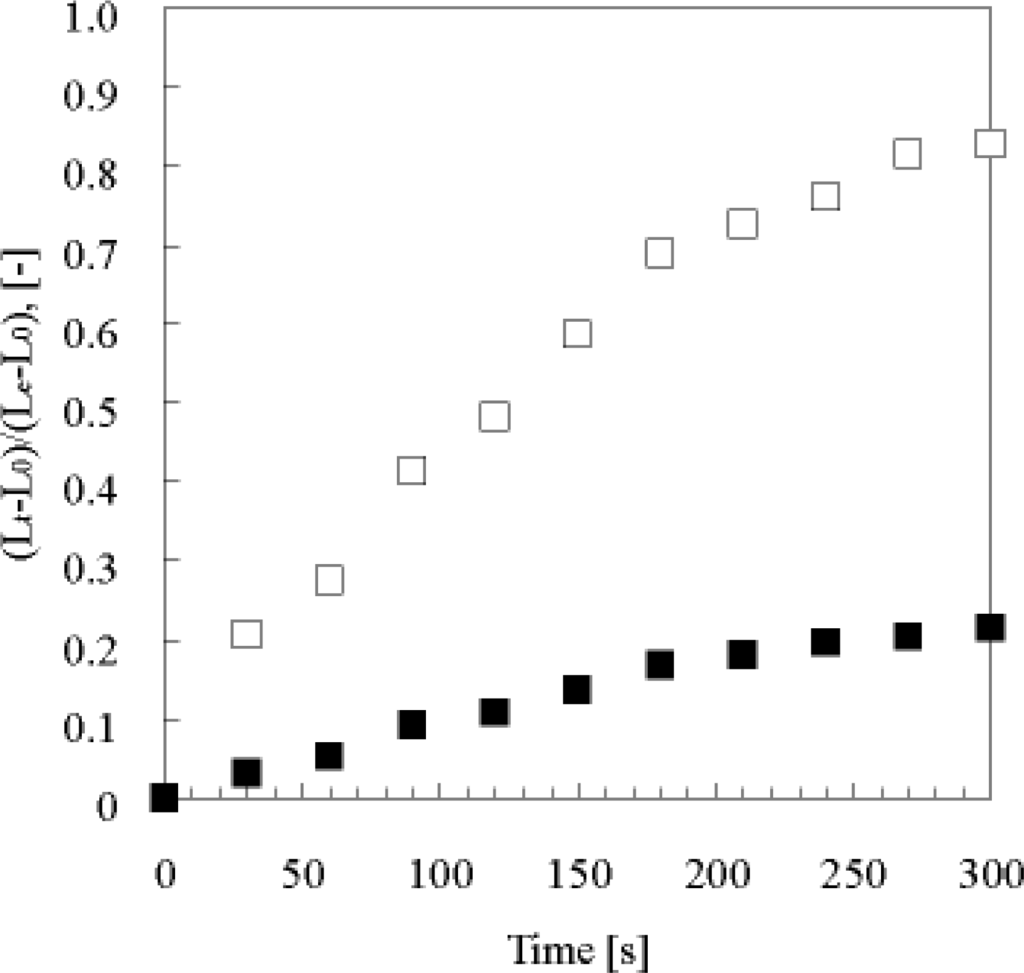 Relative swelling of microphase-separated self-oscillating gel and poly(NIPAAm-co-Ru(bpy)3) gels, (Lt – L0)/(Le – L0), in the solution of 5 mM Ce(SO4)2, 0.894 M HNO3 at 18 °C as functions of the time t elapsing after changing the solution. Lt, L0 and Le, are the lengths of the gel at t = t, initial state and equilibrium state. (□) microphase-separated self-oscillating gel; (▪) poly(NIPAAm-co-Ru(bpy)3) gel. Reproduced from [29].