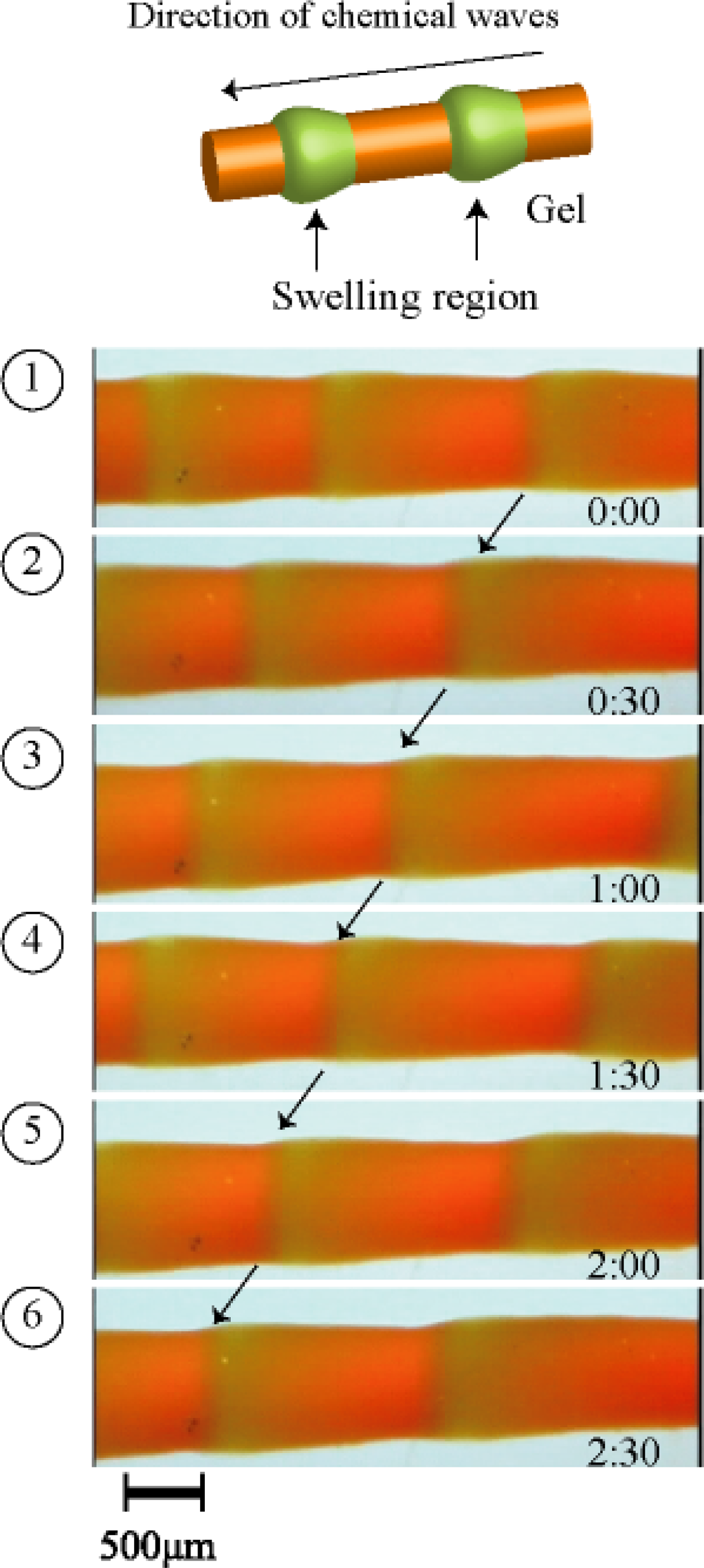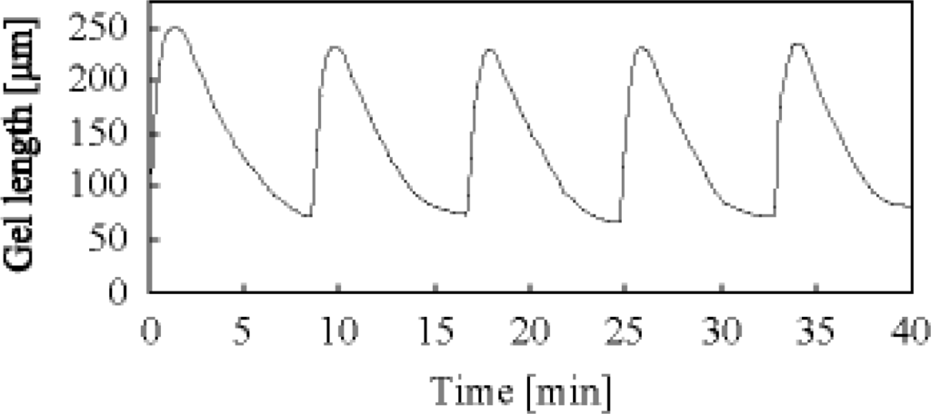 Now, the actuation of the gel is operated under non-physiological environment where the three substrates of the BZ reaction coexist. If the actuation can drive under biological conditions, realization of novel intelligent bio-machines or devices without relying on the electricity would be expected. Therefore, we have been challenging the modification of the molecular structure of the gel in order to cause self-oscillation under physiological condition, that is, only in the presence of bio-related organic acids such as citric acid [34–36]. Moreover, recently, by optimizing the polymer design, we succeeded in modifying the driving speed of the gel in 0.5 Hz [37]. The maximum frequency (0.5 Hz) of the novel gel was 20 times as large as that for the conventional-type self-oscillating gel. The autonomous peristaltic motion of the gel would create a new design method for matter transport, micro or nano devices, etc.