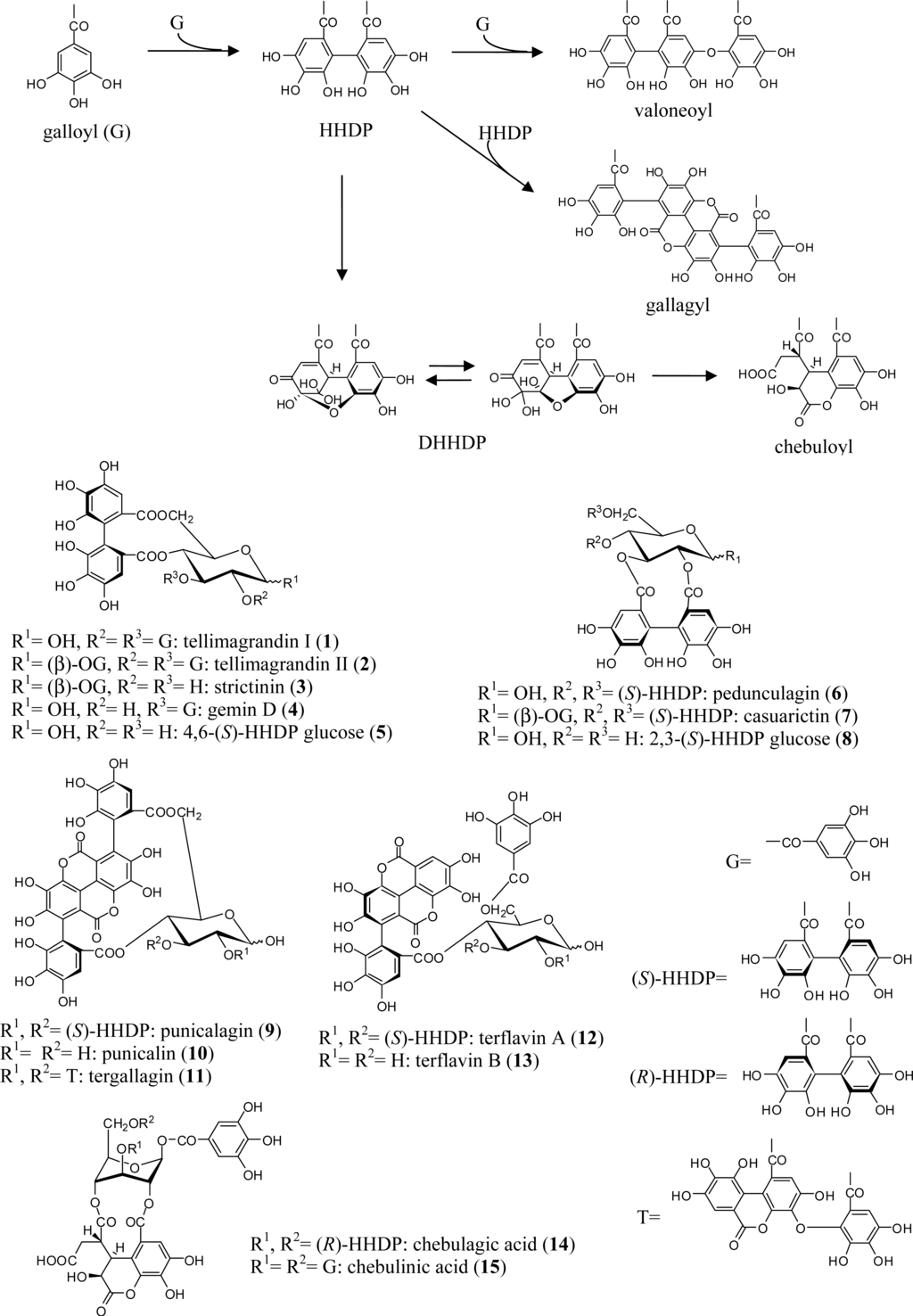 Ellagitannins are characterized by the presence of one or more hexahydroxydiphenoyl (HHDP) unit(s) on a glucopyranose core. The HHDP group is biosynthetically formed through intramolecular, oxidative C-C bond formation between neighboring galloyl groups in galloylglucoses [5]. They are easily hydrolysed, either enzymatically or with acid, to liberate a stable ellagic acid as the dilactone form of hexahydroxydiphenic acid. In addition to the HHDP group, other constituent acyl units in ellagitannins include a galloyl group and HHDP metabolites such as valoneoyl, dehydrohexahydroxydiphenoyl (DHHDP), and chebuloyl groups. Variations in the number and position of these acyl units on the glucose core provide a variety of analogs such as tellimagrandin I (1), and II (2), pedunculagin (6), casuarictin (7) [6], chebulagic acid (14), and chebulinic acid (15) [7] (Figure 1). Note that the chiral HHDP group at O-2/O-3 and O-4/O-6 of the glucose residue has an S-configuration, whereas that at O-3/O-6 has an R-configuration, as indicated by a positive and negative Cotton effect around 230 nm in their respective circular dichroism (CD) spectra [8].