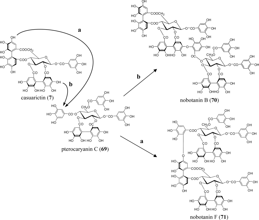 A series of studies on plant species in six genera (Medinilla, Heterocentron, Tibouchina, Melastoma, Bredia, and Monochaetum) of the Melastomataceae has revealed more than 20 characteristic ellagitannin oligomers up to pentamers, e.g., nobotanins A–C and E–T. These oligomers share two common features: (1) they are essentially composed of two different monomers, casuarictin (7; C) and pterocaryanin C (69; PC), which are coupled alternatively to form the valoneoyl unit; and (2) the galloyl group of 69 can only participate in the formation of the valoneoyl group at O-5, whereas the HHDP groups of both monomers are susceptible to bond formation regardless of their positions [65] (Figure 10).