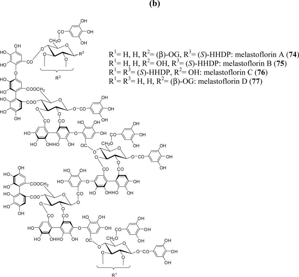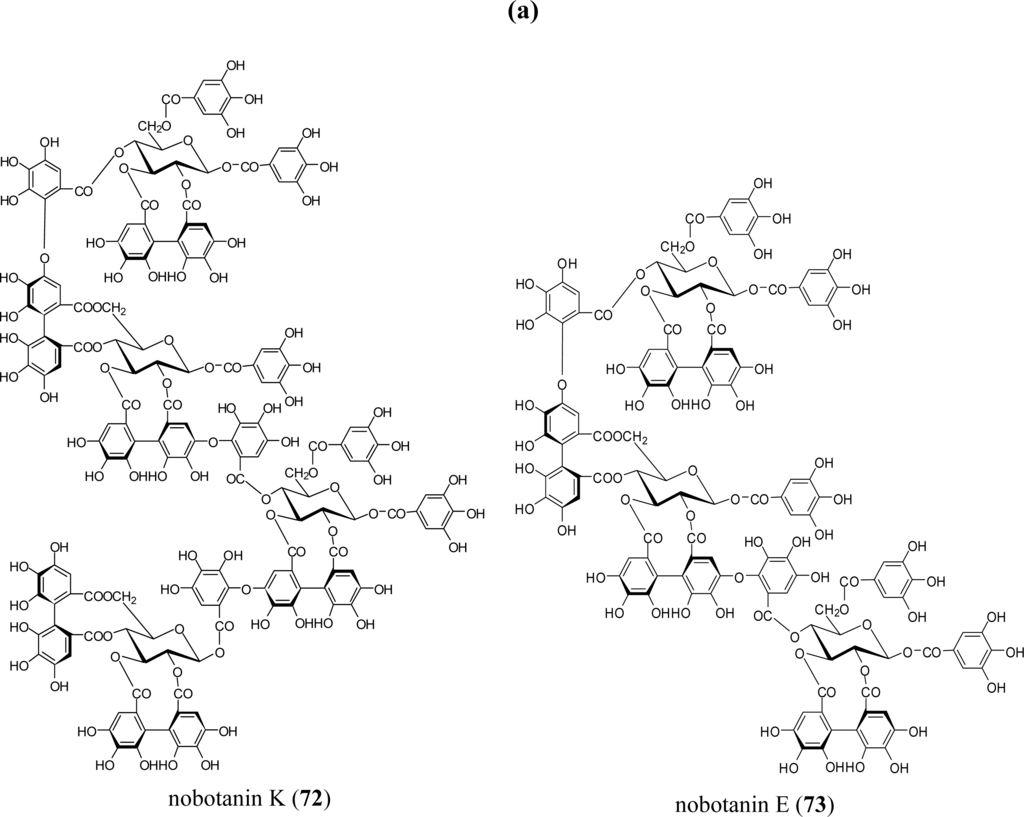 - Yoshida, T; Haba, K; Nakata, F; Okano, Y; Shingu, T; Okuda, T. Tannins and related polyphenols of Melastomataceous plants. III. Nobotanins G, H and I, dimeric hydrolyzable tannins from Heterocentron roseum. Chem. Pharm. Bull 1992, 40, 66–71. [Google Scholar]