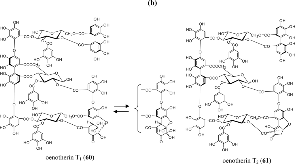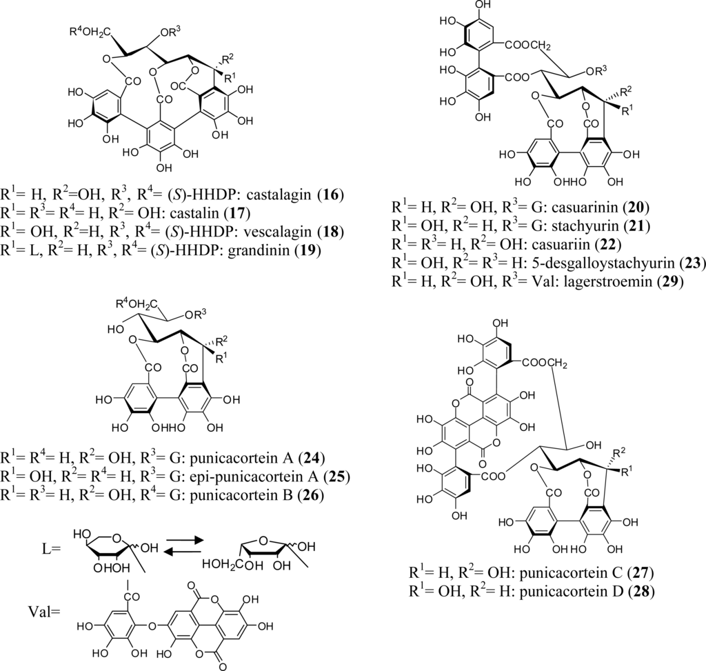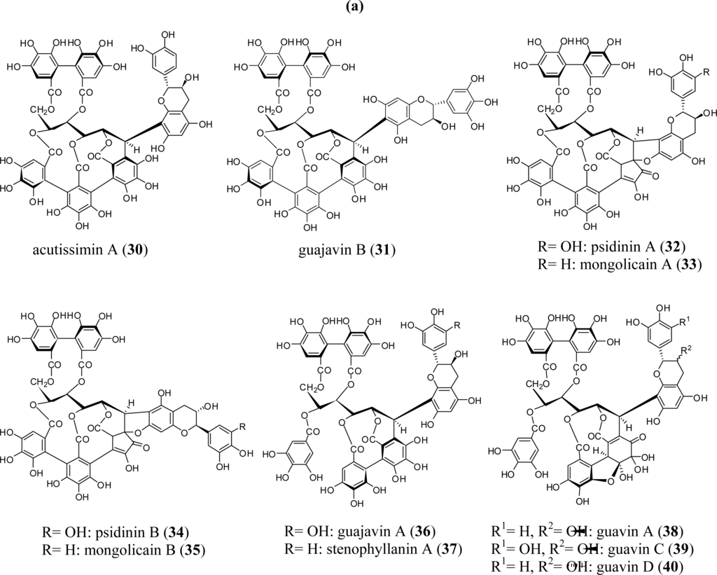 Plant tannins, one of the major groups of antioxidant polyphenols found in food and beverages, have attracted a lot of attention in recent years because of their multifunctional properties beneficial to human health. These diverse tannins may be divided into two large groups: condensed and hydrolysable. Condensed tannins are formed through the condensation of flavan-3-ols (catechins) and are often referred to as proanthocyanidins. Among the more than 500 hydrolysable tannins hitherto characterized, ellagitannins, which produce ellagic acid upon hydrolysis, constitute the largest group; the remaining group is gallotannins (galloylglucoses). The ellagitannins include: (1) monomeric ellagitannins, (2) C-glycosidic ellagitannins with an open-chain glucose core, (3) condensates of C-glycosidic tannins with flavan-3-ol (complex tannin), and (4) oligomers which are produced through intermolecular C-O or C-C bonds between monomers [1,2]. Unlike the condensed tannins that are widespread throughout the plant kingdom, ellagitannins have been found only in dicotyledoneous angiosperms. Among the plant families rich in ellagitannins are the Myrtaceae, Lythraceae, Onagraceae, Melastomataceae, and Combretaceae [3]. These families belong to the order Myrtales according to the plant classification systems of New Engler, Cronquist, and APGII (angiosperm phylogeny group) [4]. Ellagitannins have also been isolated from plant species of Trapaceae and Punicaceae, which belong to Myrtales in Cronquist’s and the New Engler’s systems. This review outlines and describes the chemotaxonomic significance of structural features found in various types of ellagitannins, focusing on representative examples found in the plants of Myrtales. Any observed antioxidative and antitumor effects of these ellagitannins are also reviewed.
