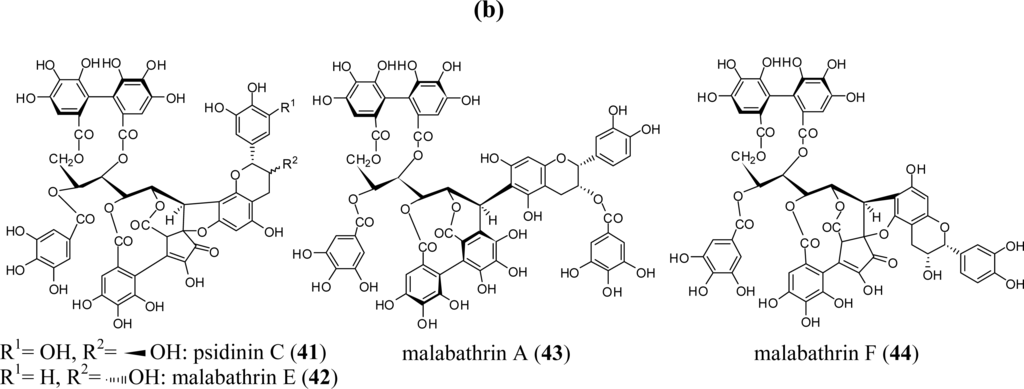 A typical example of a vescalagin-based complex tannin, acutissimin A (30) was first isolated from fagaceous plants and later found in the combretaceous plant, Anogeissus acuminata var. lanceolata [43], and the myrtaceous plant, Syzygium aqueum [21]. Another myrtaceous plant, Psidium guajava, reportedly produces a diversity of complex tannins including 30 and its analogs guajavin B (31), psidinins A (32) and B (34), and mongolicains A (33) and B (35); and the stachyurin-based analogs guajavin A (36), guavins A (38), C (39) and D (40), and psidinin C (41) [54] (Figure 3). Melastoma malabathricum, a member of the Melastomataceae, also produces metabolites from the stachyurin-based complex tannins malabathrins A (43), E (42), and F (44) [55].