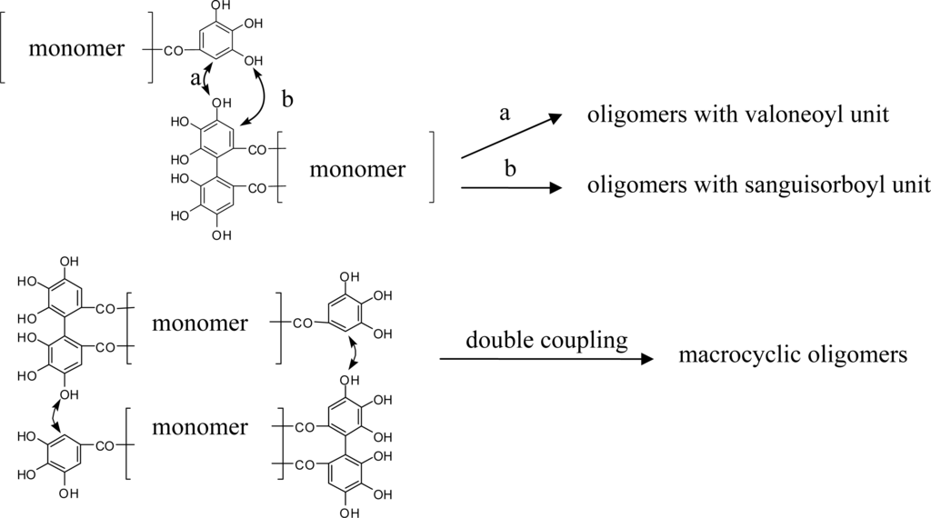 General oligomerization mode for the types 1 and 2. (1) examples of coupling mode for formation of valeoyl or its equivalent unit by C-O coupling. (2) macrocyclic dimer (double coupling for HHDP and galloyl).
