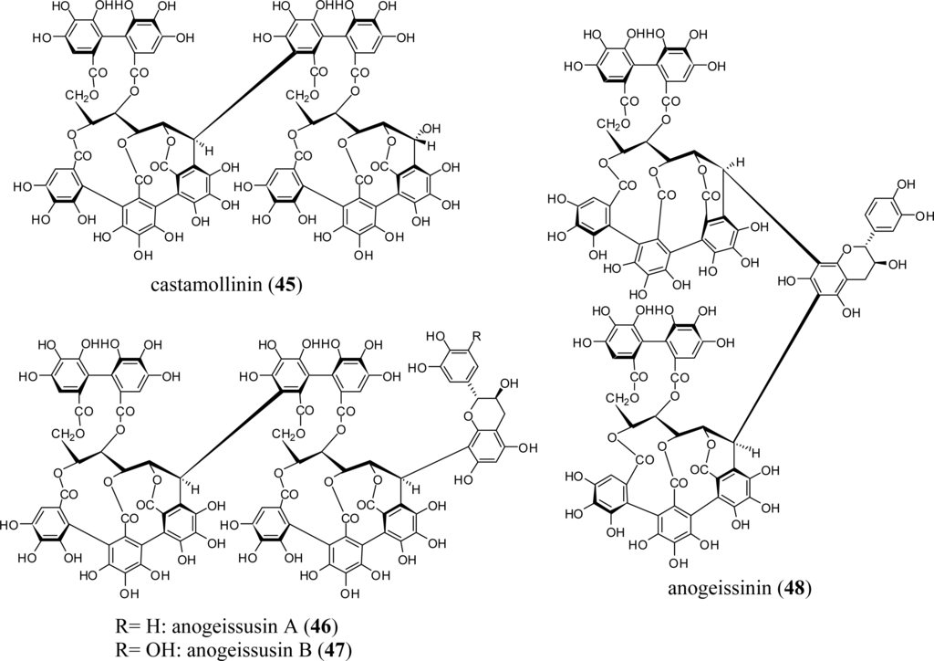 Although more than 10 of the combretaceous plant species described above have yielded various ellagitannin monomers, only Anogeissus acuminata was reported to yield C-C linked dimers of C-glycosidic ellagitannin, including castamollinin (45), anogeissusins A (46) and B (47), and anogeissinin (48) [43] (Figure 5). Dimers 46–48 are relatively rare tannins in which two equivalents of vescalagin-type monomer are connected to or through the A-ring of a (+)-catechin or (+)-gallocatechin.