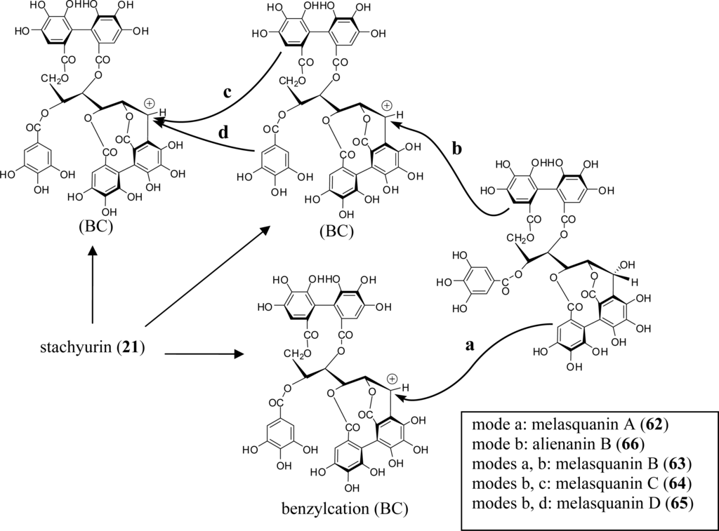 In addition to the Lythraceae and Onagraceae, oenothein B (54) has been isolated from the myrtaceous plants Eucalyptus alba [15], Eucalyptus cypellocarpa [61], Eucalyptus consideniana [16], Eugenia uniflora [62], Melaleuca leucadendron [63], and Myrtus communis [19]. Of these plants, E. uniflora, E. cypellocarpa, and M. communis also produce eugeniflorin D2 (57) with a dehydrovaloneoyl group isomeric to that in oenotherin T1 (60). It recently has been shown that the leaves of Melaleuca squarrosa, an evergreen shrub indigenous to southeastern Australia, are rich in C-glycosidic ellagitannins including several new oligomers such as melasquanins A (62), B (63), C (64), and D (65), in addition to the previously reported alienanin B (66), and casuglaunins A and B (67) [52] (Figures 7–9). These oligomers may be biosynthesized through C-C bond formation facilitated by a nucleophillic attack (a–d) of the aromatic acyl ring of casuarinin (20) on β-site of the C-1 benzylic cation from stachyurin (21) (Figure 8) in a similar manner to that described in Sections 2–3.