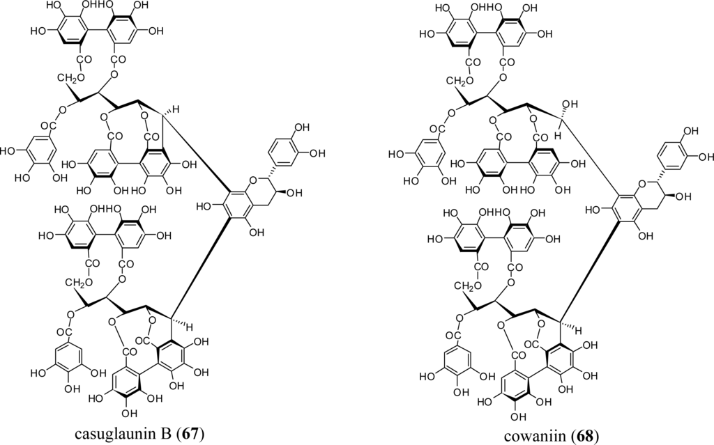 The plant also yields a unique complex tannin dimer, cowaniin (68), first obtained from Cowania mexicana (Rosaceae) [64]. The chemical structure 68 inferred from spectral data was confirmed by conversion into 67 following an acid treatment.