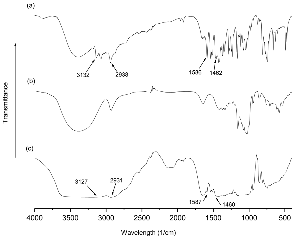 FTIR spectra of (a) TetraPhimBr, (b) pure β-CD and (c) β-CD-TetraPhimBr.
