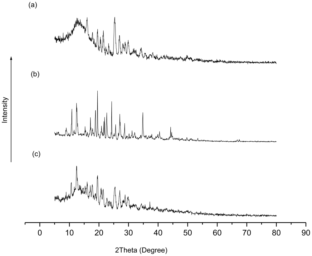 X-ray diffractograms of (a) TetraPhimBr, (b) β-CD and (c) β-CD-TetraPhimBr.