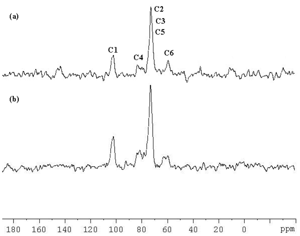 13C CP/MAS NMR spectra of (a) β-CD-TetraPhimBr and (b) β-CD.