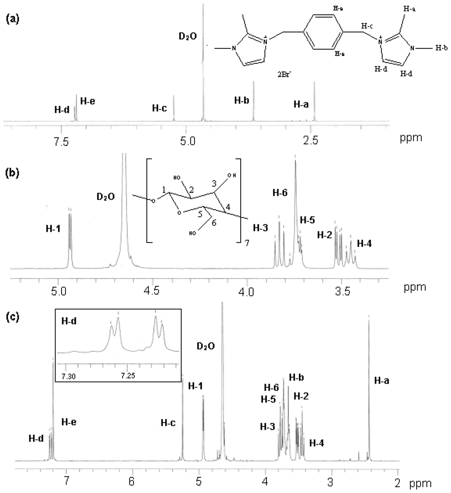 In Figure 6(a), the doublet of proton signals of the imidazolium ring of TetraPhimBr appeared as a singlet-like signal because of the fast rotation rate of the imidazolium ring relative to the NMR time scale. It is considered that the rotation rate of the imidazolium ring is slowed by the β-CD-TetraPhimBr inclusion complex formation, and as a result, those of imidazolium ring signals appear as a normal NMR pattern of the IL moiety in Figure 6(c).