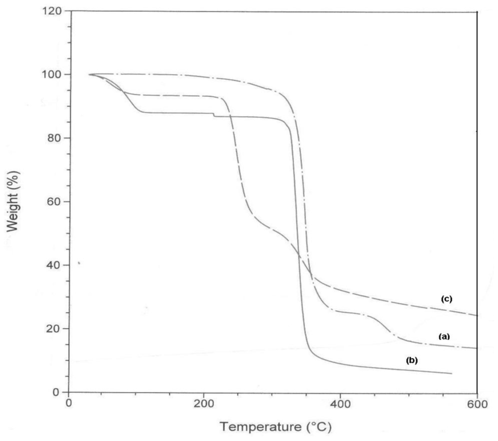 TGA curves of (a) TetraPhimBr, (b) β-CD and (c) β-CD-TetraPhimBr.