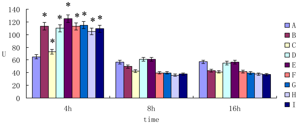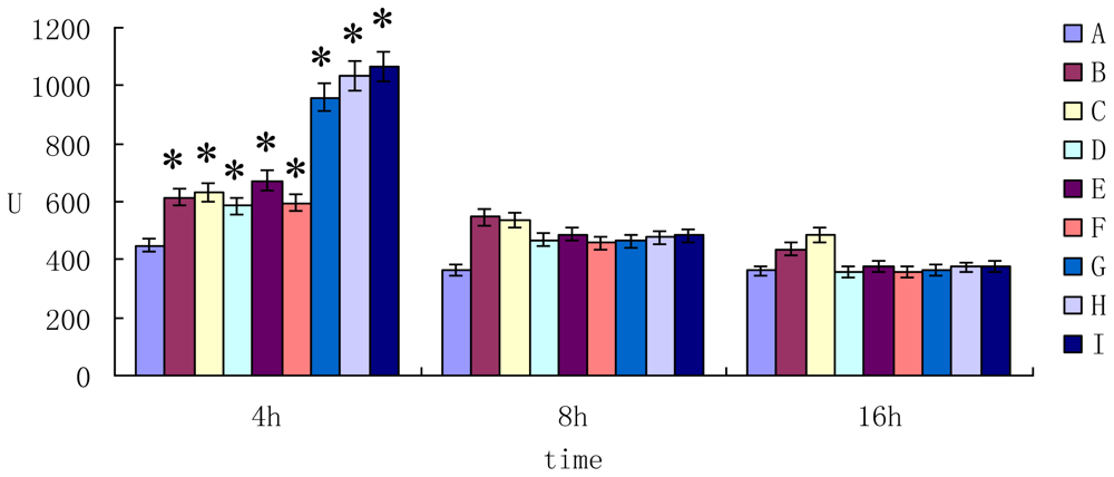 The activity of lactate dehydrogenase (LDH) in cell supernatant was shown in Figure 4. The results showed that the activity of LDH in mycotoxin group was higher than that of control group after 4 h incubation (P < 0.05). However, prolonging the cultured time (for 8 h and 16 h incubation), the difference of the activity of LDH between the groups was not significant (P > 0.05).