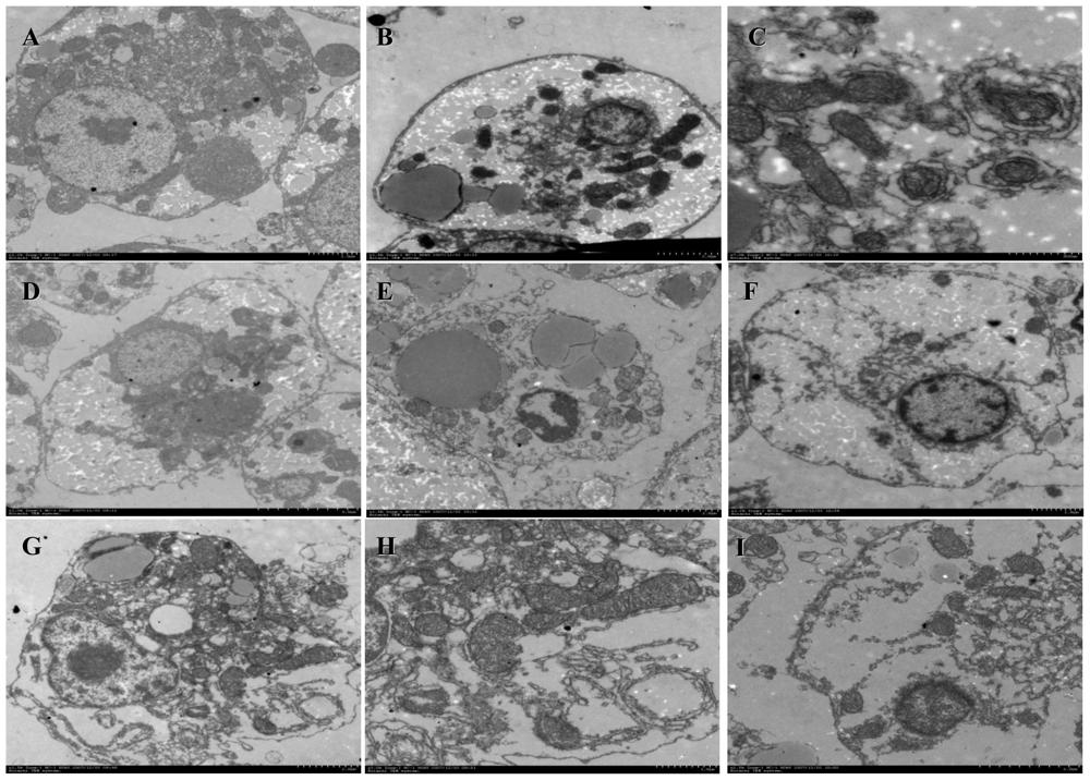 The ultrastructure of primary hepatocytes was shown in Figure 5. The cell membrane of normal hepatocytes was intact. The intranuclear chromatins were homogeneous granules. The organelles were clearness (Figure 5A). When the primary hepatocytes were cultured with the AFB1 (0.01 μg/mL), the lipid droplets, nucleus and chromatin condensation were observed clearly (Figure 5B). The saccular ectasia and vesicular structure were observed in rough endoplasmic reticulum and the smooth endoplasmic reticulum, respectively (Figure 5C). There were a lot lipid droplets and shrinkage nucleuses in hepatocytes (Figures 5D, 5E). The mitochondrial swelling was observed in hepatocytes (Figure 5F). The nuclear membrane dissolves and the endoplasmic reticulum dilation were observed in hepatocytes (Figures 5G, 5H, 5I).