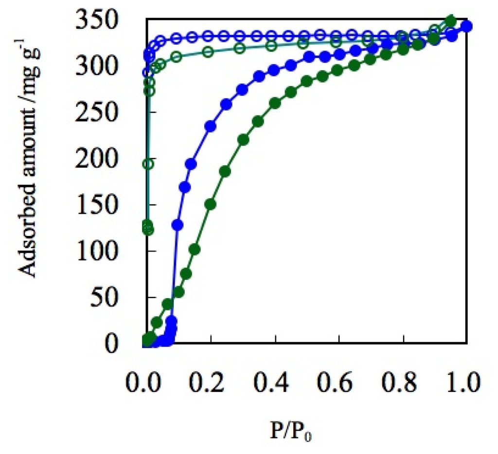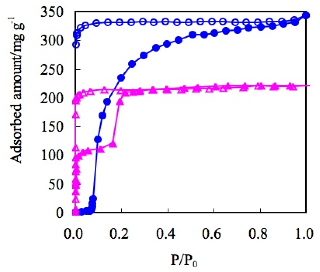 Pressure swing or temperature swing adsorption systems using porous adsorbents have been practically used in gas separation, such as that for O2/N2 and CO2/CH4 [135,245,246]. In both systems, the maximum adsorption amount is an important factor for efficiency. However, the desorption amount per pressure or temperature swing is also important and this factor is strongly influenced by the profile of the adsorption isotherm (Figure 18). An adsorbent which shows a strong affinity to an adsorbate shows a steep uprise of adsorption isotherm at the low pressure region and such kinds of adsorbent sometimes have difficulty in recovering the adsorbed gas.