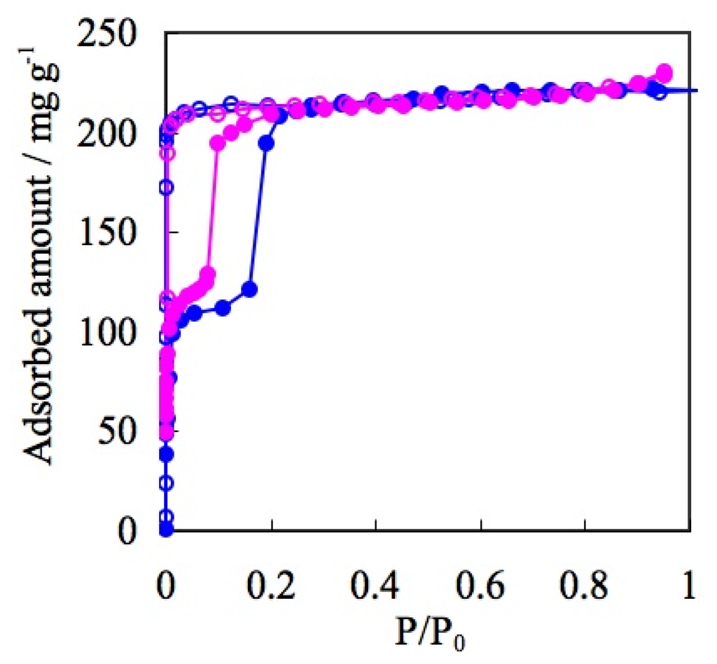 - Uemura, K; Saito, K; Kitagawa, S; Kita, H. Hydrogen-bonded porous coordination polymers: Structural transformation, sorption properties, and particle size from kinetic studies. J. Am. Chem. Soc 2006, 128, 16122–16130. [Google Scholar]