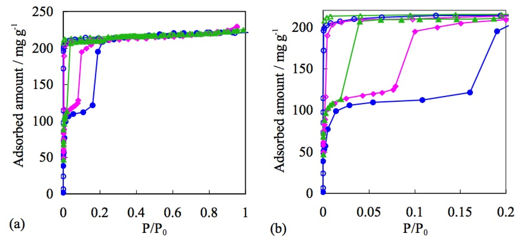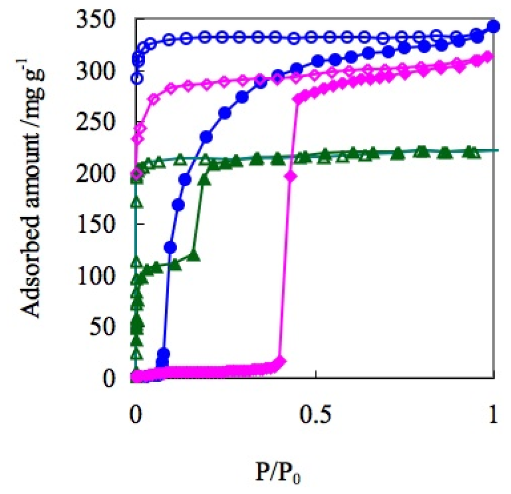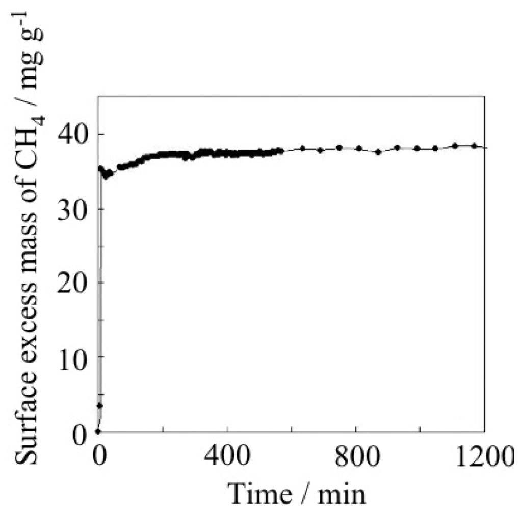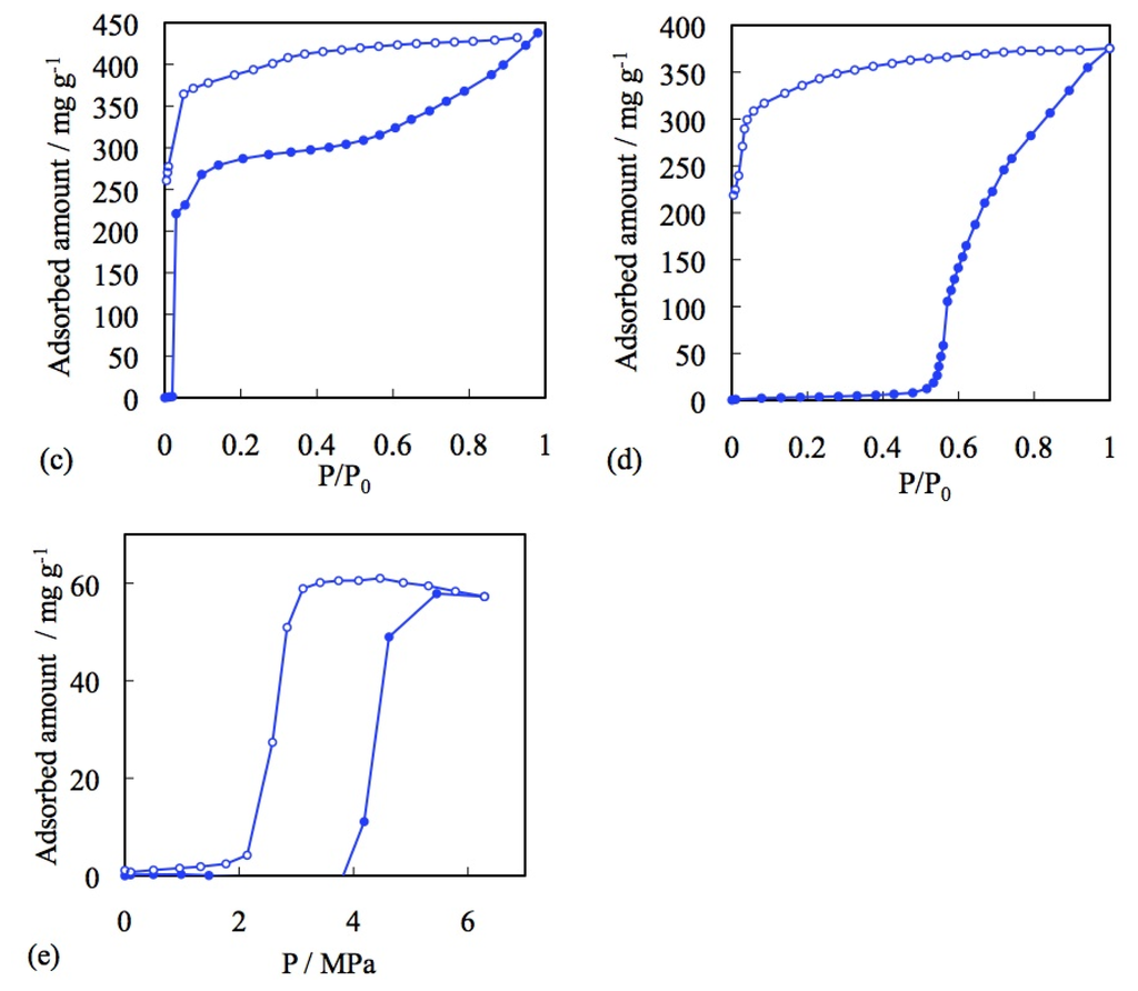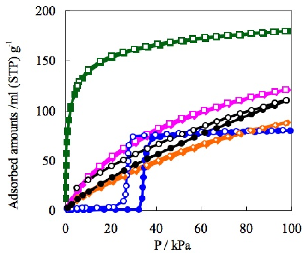 Despite the difference of the detail profile, all of the six types of adsorption isotherms show a gradual increase of the amount of gas adsorption dependent on gas pressure. Therefore, the nil gas adsorption in the low-pressure region and the sudden gas uptake profile of the “blue crystalline” CP/MOF cannot be classified by IUPAC categories. There were a number of reports on gas adsorption phenomena on PCPs/MOFs before the Li-Kaneko report in 2001. In the old example, although adsorption isotherms were not disclosed, Mori and Takamizawa reported the gas adsorption phenomena on copper complexes. Nevertheless, all of the PCPs/MOFs show traditional adsorption isotherms, which are classified by the six types of adsorption isotherms [80–93]. In other words, before the Li-Kaneko report, all of the gas adsorption phenomena on PCPs/MOFs were classified into representative physisorption by porous materials and resembled such properties, which were shown by traditional adsorbents. In this context, gate adsorption was an unprecedented phenomenon. Subsequent studies revealed that the “blue crystalline” CP/MOF shows the gate phenomena not only to CO2 but also N2, O2, and Ar [94,95]. It is noteworthy that the “blue crystalline” CP/MOF also shows a gate response to supercritical CH4 at 303 K that usually shows very small interaction to adsorbent (Figure 2) [96].