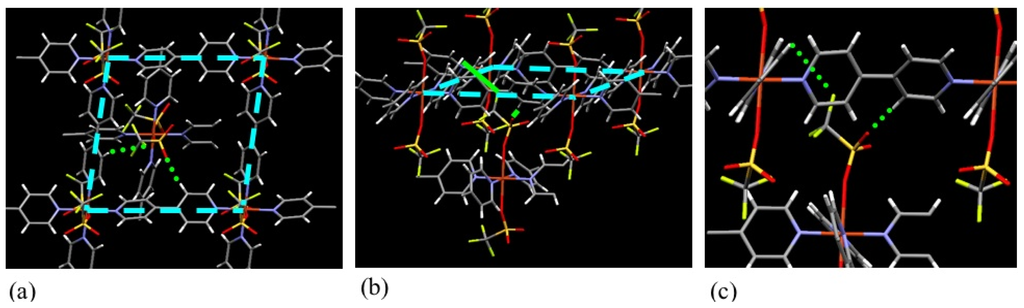 Hydrogen bonding between the counter anion and bpy of the neighboring layer (ELM-12): (a) square grid and OTf anions (top view), (b) square grid and OTf anions (side view), (c) hydrogen bonding between the OTf and the bpy.