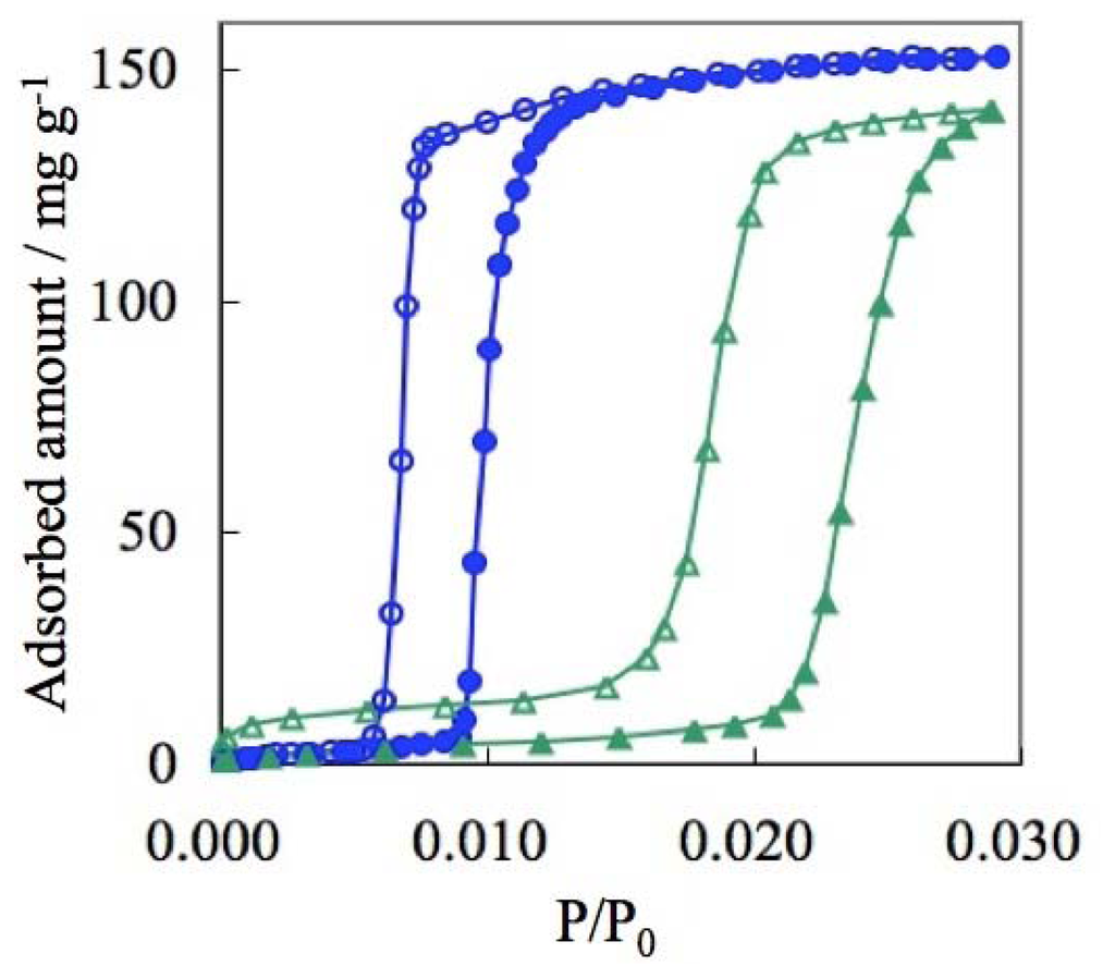 On the other hand, ELM-12 (Cu), containing trifluoromethanesulfonate (OTf) as a counter ion, shows a definite double step adsorption isotherm, while the rising profile is almost vertical (Figure 11) [67]. From the detailed structural study using synchrotron X-ray diffraction analysis, it was revealed that the ELM-12 has open micropores at the initial stage, and the first vertical adsorption step is assigned to micropore filling in the inherent micropores. This is in marked contrast to the nonporous nature of ELM-11, in spite of the common analogous fundamental two-dimensional layer structure. This difference is derived from only slight difference in stacking structure; the layers of ELM-11 are stacked in a complete staggered form, so that the bpy molecules cover the open space of metal-organic square grids in the neighboring layers. On the other hand, the layers of ELM-12 are also stacked in zigzag fashion, but the slipped degree is smaller than that of ELM-11 hence ELM-12 affords effective micropores to accommodate gases. In addition, the slightly larger inter-layer distance of ELM-12 compared to that of ELM-11 also help generate porosity at the initial stage. Furthermore, it is also revealed that the second adsorption step is derived from layer expansion phenomena accompanied with the gas-ELM clathrate generation in a way analogous to the gate phenomena of ELM-11.