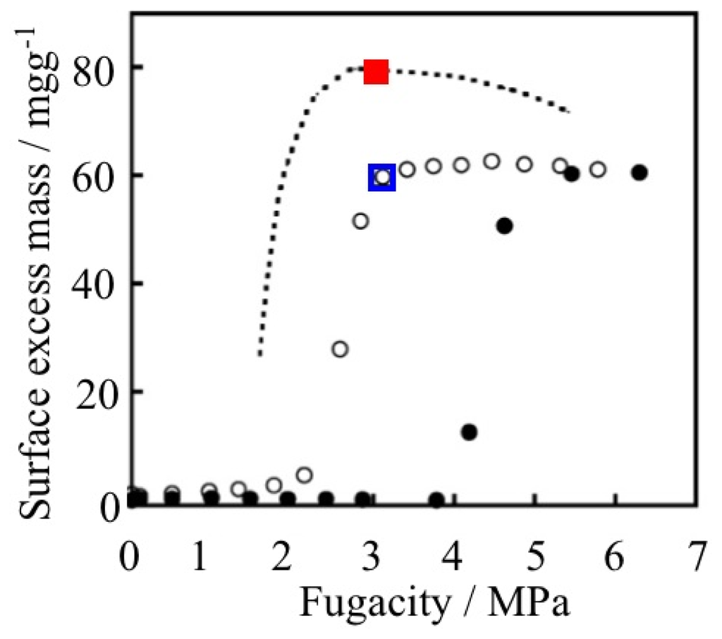 Temperature jump experiment of CH4 adsorption on ELM-11. The open and closed circle show CH4 adsorption and desorption on ELM-11 at 303 K, respectively. The temperature was dropped from the blue square (303 K) to the red square (273 K) and was then elevated from the red square to the blue square. The thin dashed line shows desorption branch at 273 K, which was measured by another experiment.
