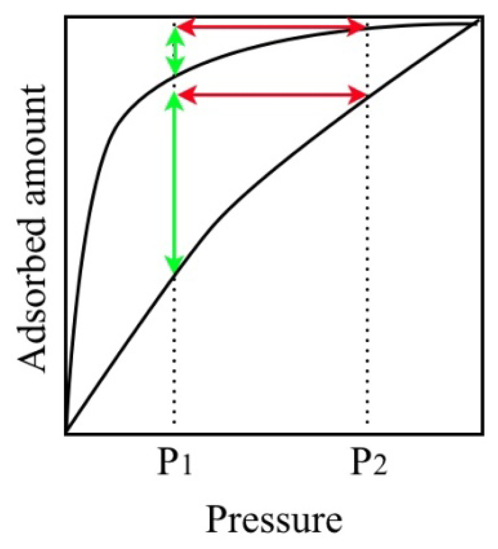 Representative example of two types of adsorption isotherm and the relationship between the pressure swing width and the amount of recoverable gas. The red arrow shows the pressure swing width and the green arrow shows the recovered gas amount by the pressure swing from P2 to P1, respectively.