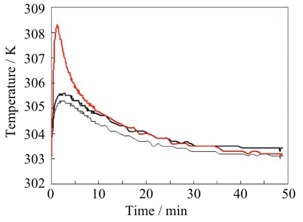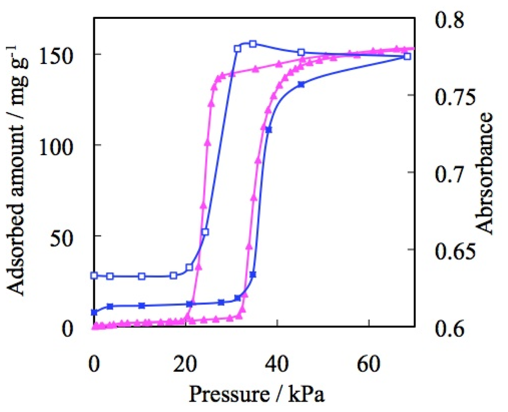 The gate adsorption/desorption phenomena of CPs/MOFs have been discussed both from the viewpoint of kinetics and thermodynamics [236–238]. In the case of ELMs, it is confirmed that both the gate opening and closing states are in a thermal equilibrium [96]. Methane gas-pressurized ELM-11 at 303 K at 2.5 MPa is in the gate-open stage. When the sample was cooled to 273 K, the adsorption amount increased and the amount was coincident with that of the desorption branch of 273 K. When the cooled sample was, in turn, warmed to 303 K, the adsorption amount was decreased and the amount was coincident with that of the desorption branch of 303 K (Figure 17). From these experiments, it is apparent that ELM-11 at the gate-open state is a thermodynamic product. The thermal equilibrium of the gate-closed state of ELM-11 was also confirmed by CO2 adsorption experiments. Although the gas pressure was retained for 13 hours at ambient temperature at slightly under the gate opening pressure, ELM-11 did not adsorb the gas. This experiment also strongly supports the equilibrium nature of ELM-11 before the gate opening.