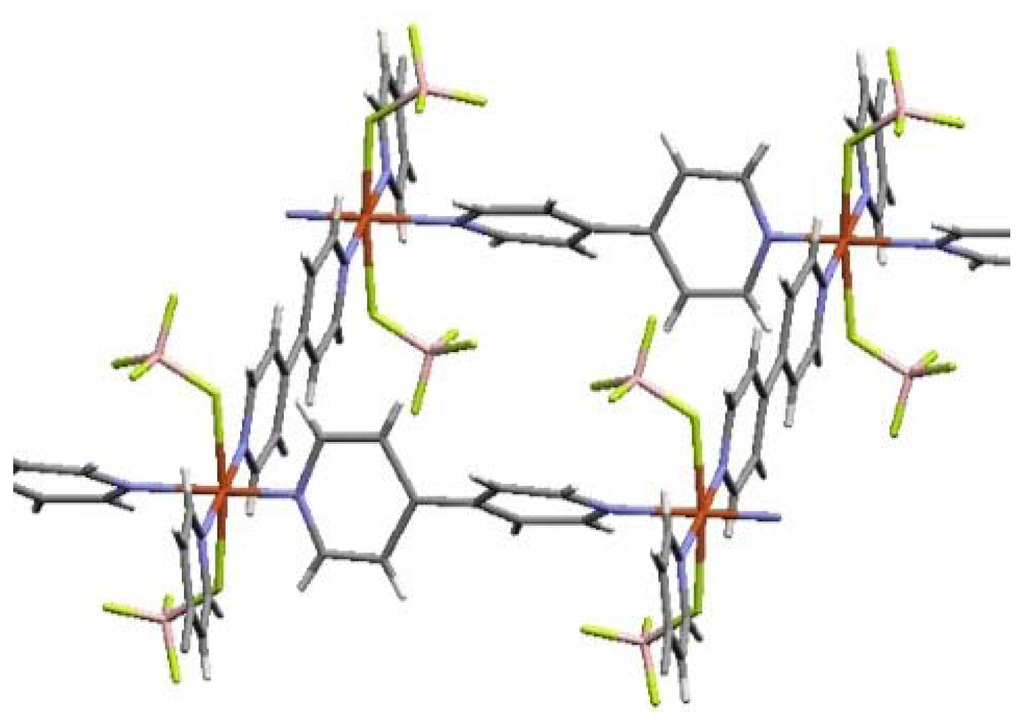 The Cu2+ ions are octahedrally coordinated by four bpy ligands at the equatorial positions to give two-dimensional, square grid sheets (Cu-Cu squares: 11.15 × 11.15 Å), while two BF4− anions occupy the transaxial positions (Figure 4) [99]. Although the square grid motif constructed by linear bidentate ligand and Cu2+ is not uncommon, BF4− anion, which has a weak coordination ability and coordinated structure, is relatively unique [100–106].
