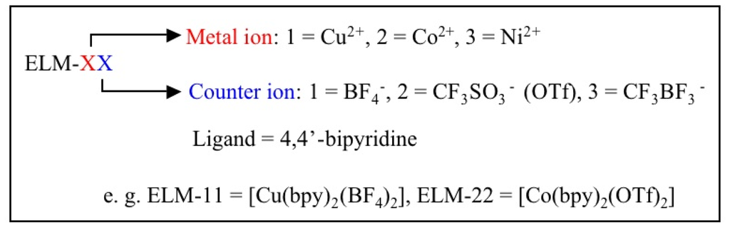 Here a detailed expansion of the name of ELMs is given. We named the expansive/shrinking flexible CP/MOF as an ELM—an elastic layer-structured metal-organic framework. A series of isostructural ELMs with various metal ions, counter ions, and ligands were developed by our group. The metal and counter ions play an essential role in the structure and property and thereby the composition is added to ELMs for a specified ELM family, with the compositions of their components shown in Figure 9.