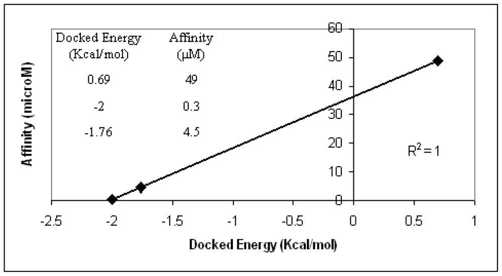 The AutoDock3 program was used for docking the above ligands into the binding areas of dimer12 and dimer28. The three ligands were not properly allocated by the program when dimer12 was considered. It means that no favorable conformations enabling interactions between each ligand and the two Ca2+ ion of interest were found. Optimal ligand conformations interacting with the two Ca2+ ions were found, instead, in the case of dimer28. Moreover, docking energy scores obtained for such conformations are in optimal agreement with the experimental affinity data (Figure 3). Based on the above validation check, the model that most realistically fits the experimental affinity trends is dimer28.