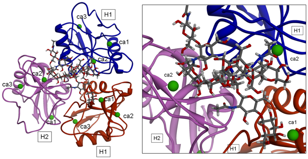 Moreover, concerning the interactions with the H1 subunits, experimental assays suggested that the two groups of the ligand interact with two different galactose binding sites on two different H1 subunits [11].