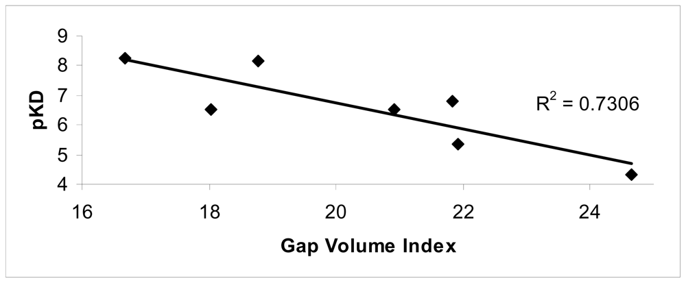 Comparison between Gap volume index values for the optimized complexes and their experimental data affinity (pKD).
