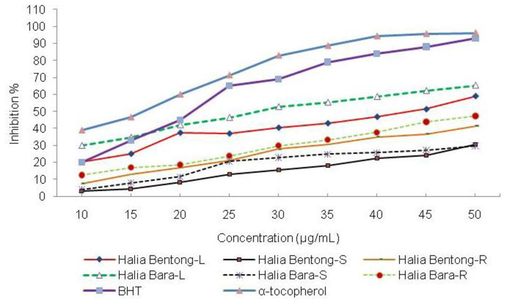 Two different light intensities (310 and 790 μmol m−2s−1), based on the high content of TF and TP, were chosen for the DPPH scavenging assay. The results of the assay are shown in Table 2 and Figure 1. From the data in Figure 1 and Table 2, it is apparent that the extracts from ginger grown under 310 μmol m−2s−1 showed a significant effect in inhibiting DPPH, reaching up to 60% in Halia Bara leaves and 55% in Halia Bentong leaves at concentration 45 μg/mL and its IC50 was 27 μg/mL for Halia Bara and 40 μg/mL for Halia Bentong Leaves. However, at the same concentration (27 and 40 μg/mL), the IC50 values of Halia Bentong and Halia Bara leaves grown under 790 μmol m−2s−1 were 42 and 40%, respectively.