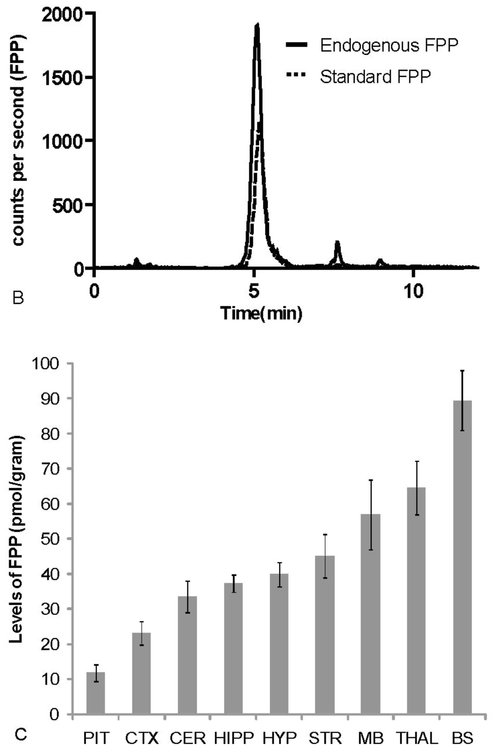 (A) structure of FPP (B) co-eluting peaks for synthesized FPP (standard FPP) and a representative brain constituent (Endogenous FPP) (C) distribution of FPP in selective brain areas. Abbreviations: PIT, pituitary; CTX, cortex; CER, cerebellum; HIPP, hippocampus; HYP, hypothalamus; STR, striatum; MB, midbrain; THAL, thalamus; BS, brain stem.