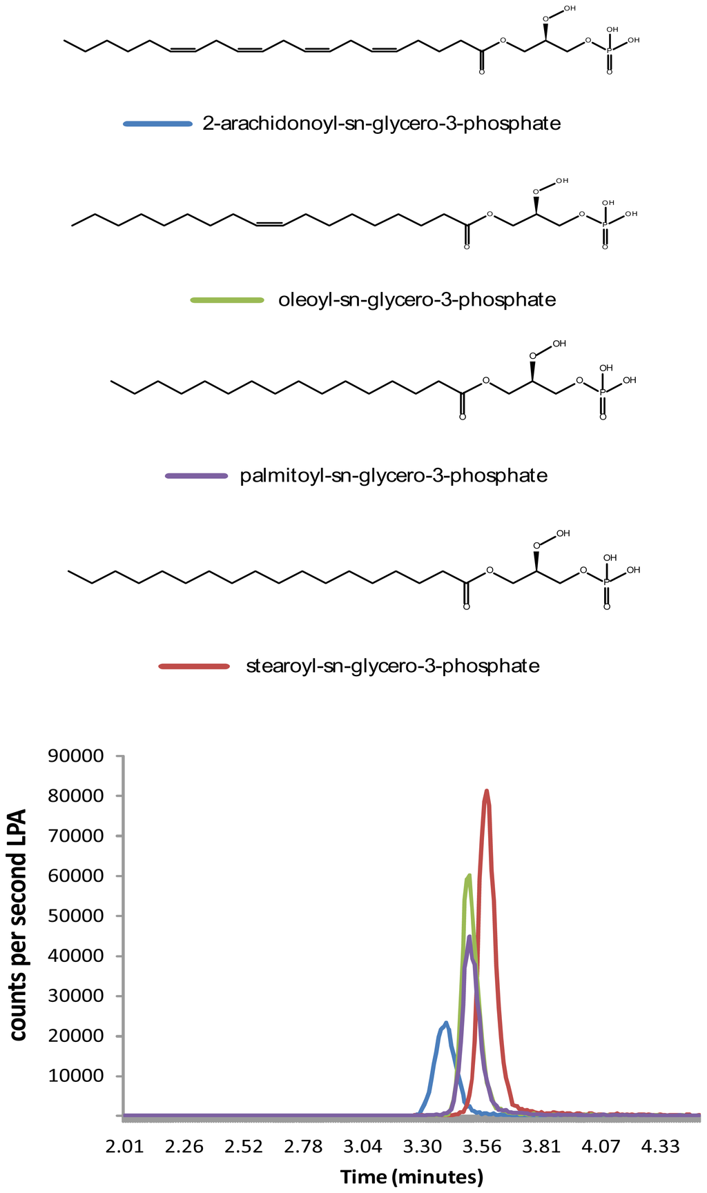 Structure of four LPA species and corresponding HPLC/MS/MS chromatographs for each of these species from brain extracts. Colors for each chromatographic peak correspond to the color bar next to the name of the LPA. Using the C18 reversed phase analytical column the least saturated LPA (arachidonoyl-sn-glycerol-3 phosphate) elutes first and the longest and completely saturated LPA (stearoyl-sn-glycerol-3 phosphate) elutes last.