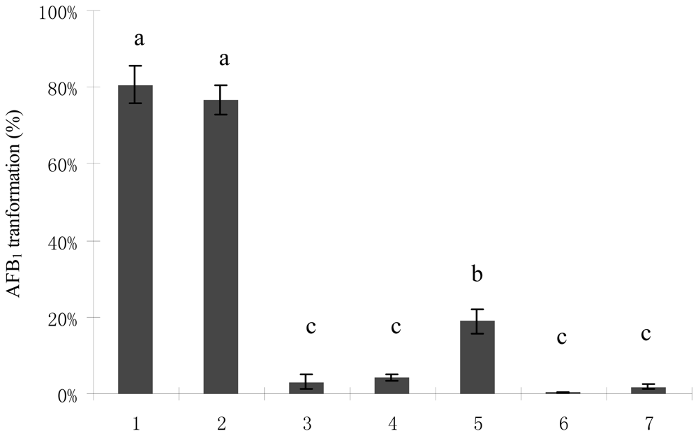 AFB1 biotransformation by M. fulvus ANSM068. 1. Liquid culture; 2. Culture supernatant; 3. Cell extracts; 4. Cell; 5. Proteinase K (Prok) treated culture supernatant; 6. Prok + SDS treated culture supernatant; 7. Heat treated culture supernatant. The reactions were performed at 30 °C for 72 h. Each value is a mean ± SE of three replicates. Means within a row with no common letters differ (P < 0.05).