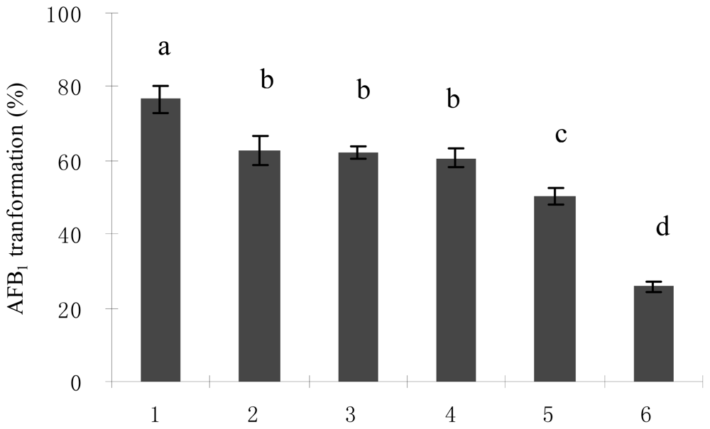 To date, there are only a few reports on extraction or purification of mycotoxin biotransformation active components from microbial metabolites. Liu et al. [] extracted and purified an intracellular enzyme from fungi Armillariella tabescens by ammonium sulfate precipitation, ion exchange chromatography and chromatofocusing chromatography. The AFB1 detoxification enzyme was then characterized to have a molecular mass of 51.8 kDa by SDS-PAGE and it exhibited a specific activity of 7.09 nmol min/mg at pH 6.0 and 28 °C. Motomura et al. [] purified an aflatoxin biotransformation enzyme from the edible mushroom Pleurotus ostreatus by two chromatographies on DEAE-Sepharose and Phenyl-Sepharose. The apparent molecular mass of the purified enzyme was estimated to be 90 kDa by SDS-PAGE. This study has confirmed that the AFB1 biotransformation components exist in the culture supernatant and are very likely enzyme(s). Further purification and identification of the enzyme(s) are undergoing.