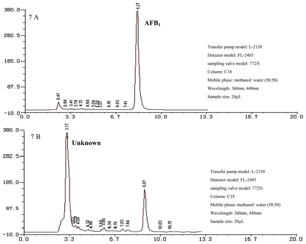 Detection of AFB1 biotransformation product by HPLC. (A) AFB1 standard with concentration of 100 ppb in liquid VY/2 medium. The peak at 8.27 min represents AFB1. (B) AFB1 treatment after 72 h incubation with culture supernatant. Peak at 3.17 min represents AFB1 biotransformation product.