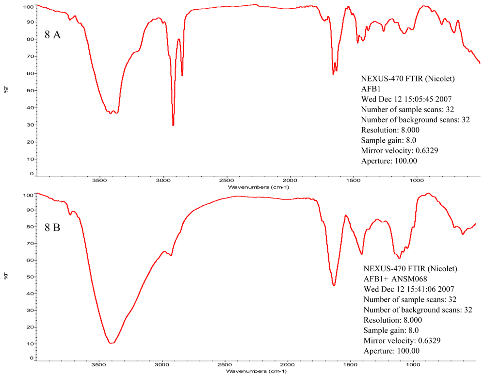 Additionally, the HPLC chromatograph (Figure 7) confirmed that AFB1 (peak eluting at 8.27 min) was biotransformed to a new product eluting at 3.17 min. The IR spectrum showed that there were three major modifications in absorption peaks between the standard AFB1 and the product resulting from culture supernatant treatment (Figure 8). The absorption peak at 1728 cm−1 in AFB1 standard disappeared after the treatment, which indicates that the lactone attached to the benzene ring was modified. The two peaks in the area between 1658 and 1634 cm−1 in AFB1 standard changed into one peak after treatment. The change at 2930 cm−1 indicates modification of methyl group.