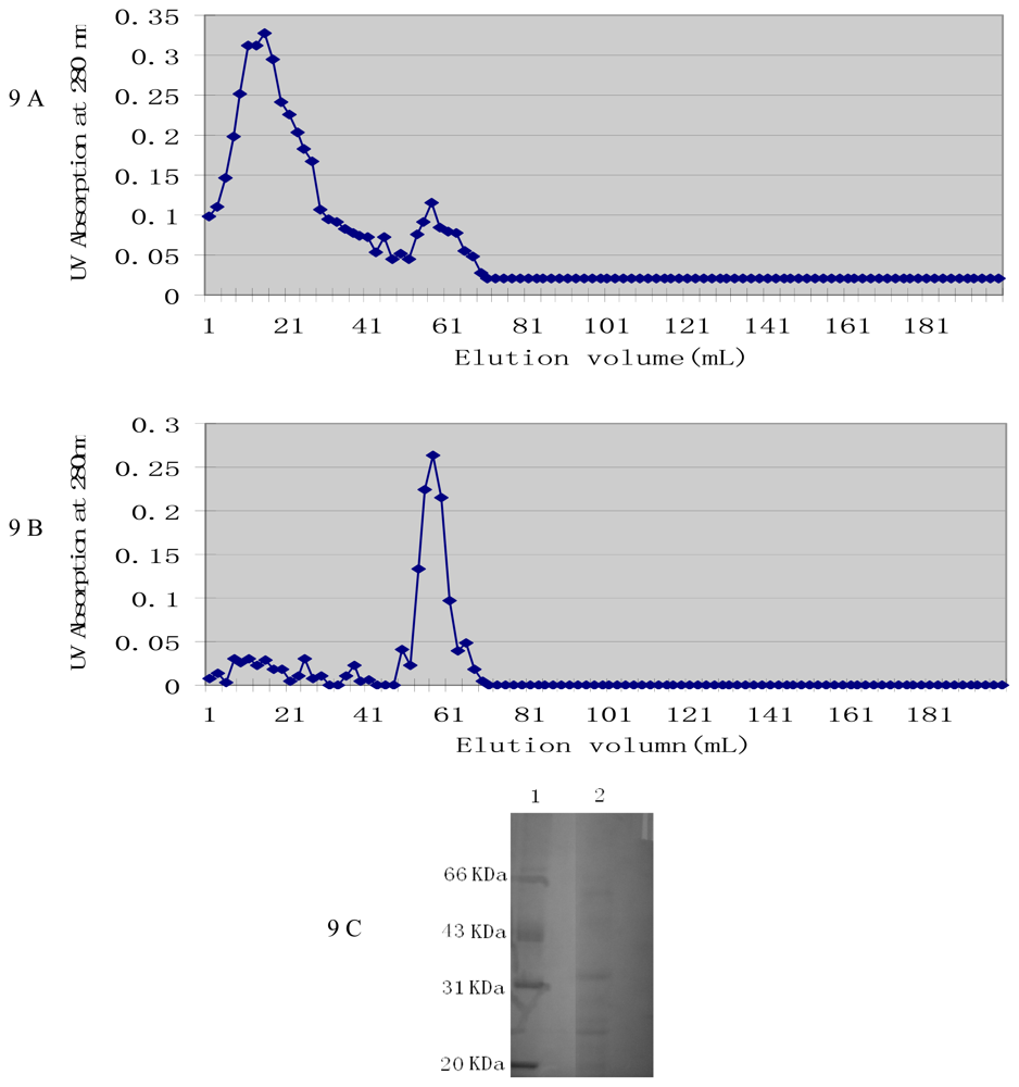 Determination of active components from culture supernatant by chromatography and SDS-PAGE. (A) Ion exchange chromatography on DEAE A-50 column. The column was pre-equilibrated with 50 mM sodium phosphate buffer pH 7.5. Elution was performed with the same buffer for the first 40 mL and then by a gradient of 0.5 M NaCl added to the buffer. Fractions of 2 mL were collected in tubes at a flow rate of 0.4 mL/min. (B) Molecular sieve chromatography on Sephadex G-100 column. The column was pre-equilibrated with 50 mM sodium phosphate buffer pH 7.5 containing 0.2 M NaCl. Proteins were eluted with the same buffer. Fractions of 2 mL were collected in tubes at a flow rate of 0.2 mL/min. (C) SDS-PAGE analysis of AFB1 biotransformation enzyme after purification by chromatography. Lane 1, Calibration marker proteins (Pharmacia LKB), 5 μL/lane; lane 2, peak fractions with AFB1 biotransformation activity from Sephadex G-100 chromatography, 20 μL/lane.