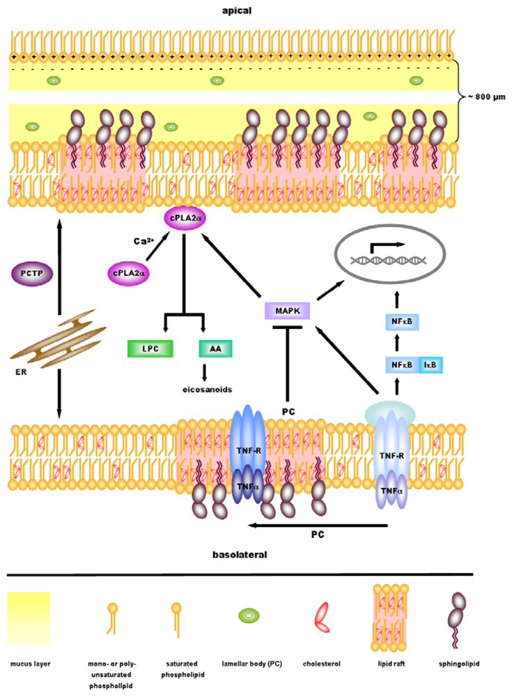 Anti-inflammatory signaling by phosphatidylcholine (PC) at the mucosal barrier. At the mucosal gastrointestinal barrier, PC is located as firstly, luminally extended monolayer and, secondly, lamellar bodies within the mucus. Interaction of the inversely charged PC headgroups and mucins establishes a hydrophobic barrier which prevents invasion of bacteria through the mucus layer. PC modulates inflammatory signaling cascades by its integration into the enterocyte membrane. It changes the compartmentation of TNF receptors to lipid rafts, inhibits NF-κB activation, prevents MAP kinase phosphorylation and subsequent activation. The cytosolic phospholipase cPLA2α is activated by calcium binding which triggers its translocation to PC enriched membranes. Degradation of PC results in the production of LPC and arachidonic acid; the latter serving as an essential precursor for eicosanoid biosynthesis. Membrane binding and catalytic activity of cPLA2α are enhanced by MAP kinase mediated phosphorylation. PC molecules are shuttled within cells from the ER to plasma membranes via PC transfer proteins (PCTP), thus allowing the modulation of the membrane PC content. The interplay of these signaling events finally results in the modulation of the inflammatory response.