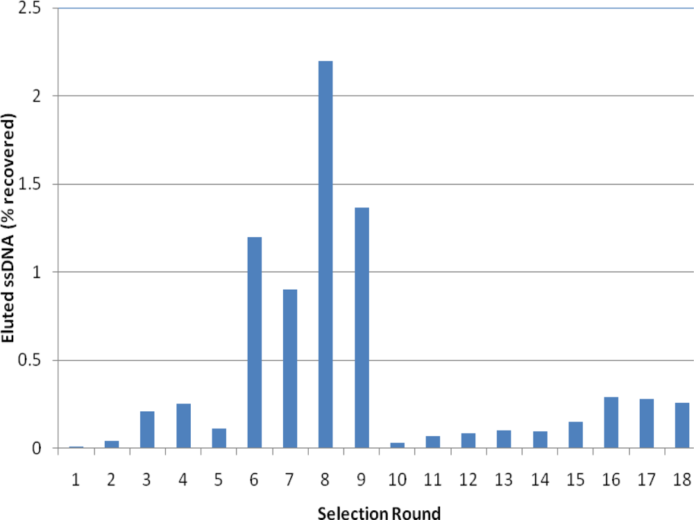 In the initial few rounds, the maximum amount of target immobilized beads (5 × 108 beads) was used for selections. This was to ensure complete capture of binding sequences. However, every 4–5 rounds, the number of magnetic beads used for positive selection, and therefore the amount of target available for binding, was reduced 2- to 5-fold (see Table 1). This decrease in the concentration of the target increased the stringency of the selection round, allowing for competition between sequences within the selection. Competition for the fewer binding sites should ultimately yield tighter-binding aptamers. Tok et al. described a novel method to generate DNA aptamers by using a single target-immobilized microbead. They found that the weak binding aptamers were displaced by the higher affinity aptamers. After only two selection cycles, aptamers displaying dissociation constants in the low nanomolar range were obtained [].