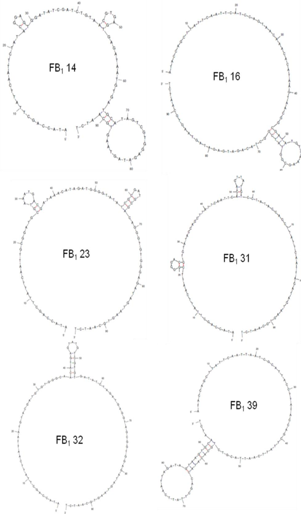 Six unique sequences were obtained after cloning from round 18 (see Table 2). Surprisingly, sequences having the highest incidence (FB1 31 and FB1 39) have the lowest G content. Typically, aptamers are G rich, for example, the DNA aptamer for OTA (47% G) [], the DNA aptamer for ATP (45%) [], the DNA cocaine aptamer (32%) [] and the DNA aptamer for fibronectin (33%) [].