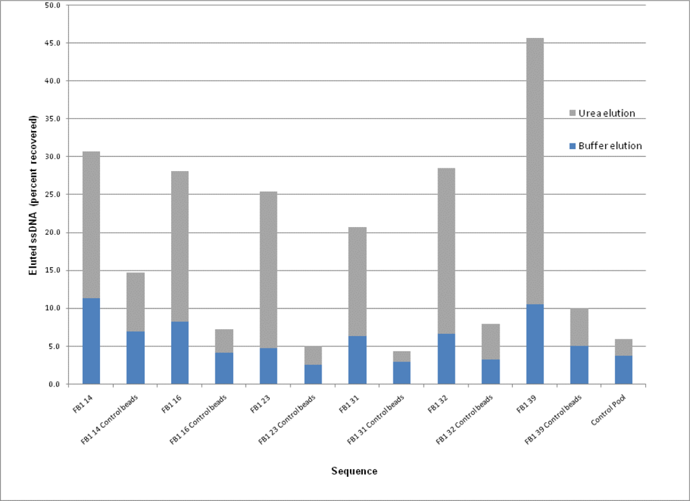 Each aptamer clone was tested for its ability to bind to FB1 derivatized beads using a fluorescence binding assay. This allowed for comparative determination of the relative binding ability of each aptamer generated in the selection experiment. The selection conditions used in the SELEX experiment were used for these binding assays, using aliquots of FB1 derivatized beads as the target. To remove any non-binding or weakly-bound DNA, many washes were performed. Bound DNA was eluted first with column buffer at 90 °C. Elution using high temperatures is sufficient to denature most target-DNA interactions; however, the addition of the denaturant urea, in our experience, is able to displace even the strongest, non-covalent, interaction. The comparison of binding DNA eluted only with 90 °C buffer compared to 90 °C urea can be found in Figure 4. The specific binding of the aptamers to the target was compared to binding of the unenriched initial library (Control Pool). Binding assays were also performed on unmodified (control) magnetic beads. This was done to ensure that the individual clones were binding specifically to FB1 and not simply non-specifically interacting with the surface of the magnetic beads.