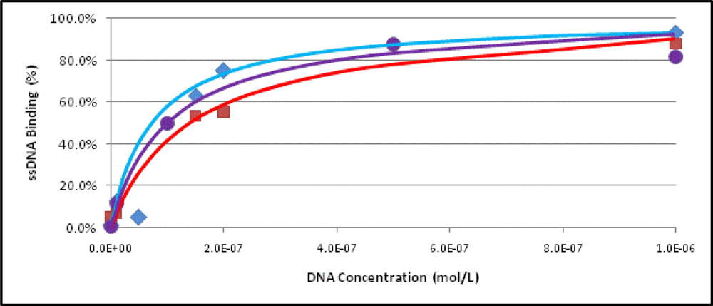 The starting DNA library was synthesized on a 1 μmol scale on a MerMade 6 Oligonucleotide synthesizer (BioAutomation Corporation, USA) using standard phosphoramidite chemistry. The sequence is 96 nucleotides in length, containing a central region of 60 random nucleotides flanked by two primer binding sites necessary for PCR and cloning: 5′-ATACCAGCTTATTCAATT-N60-AGATAGTAAGTGCAATCT-3′. The following primers used for amplification and cloning of the selected oligonucleotides were synthesized: Primer1: 5′- ATACCAGCTTATTCAATT-3′ and Primer2: 5′-AGATTGCACTTACTATCT-3′. Modified primers were also synthesized to allow for fluorescent labeling of the binding DNA and separation of strands on a denaturing polyacrylamide gel: ModPrimer 1: 5′-fluorescein-ATACCAGCTTATTCAATT-3′ and ModPrimer 2 5′-poly-dA20-HEG-AGATTGCACTTACTATCT-3′. All synthesized DNA was purified through denaturing polyacrylamide gel electrophoresis (12%) followed by clean-up with Amicon YM-3 Centrifugal Filter Devices.