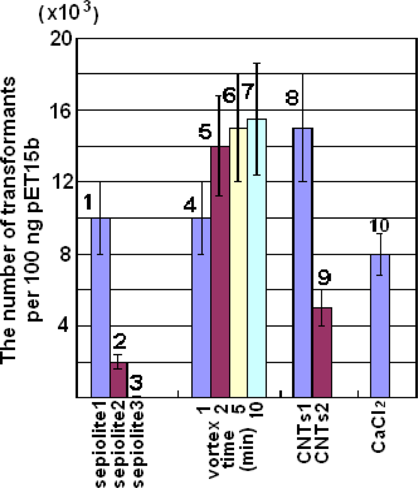 DNA transformation for Escherichia coli DH5α based on sepiolite and vortex mixing. (1–3) Untreated sepiolite (sepiolite 1), the sepiolite collected from the supernatants (sepiolite 2) and ultrasonicated sepiolite (sepiolite 3); (4–7) Effect of varying vortex operation time for sepiolite 1, from 1 to 10 min; (8–9) Untreated CNTs (CNTs1) and ultrasonicated CNTs (CNTs2). CaCl2 refers to chemical transformation method.