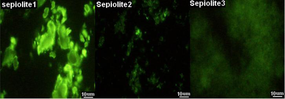 After absorbing GFPuv, the shape of sepiolite is observed by fluorescence microscope. There are three kinds of sepiolite: untreated sepiolite (sepiolite 1), the sepiolite collected from the supernatants (sepiolite 2) and ultrasonicated sepiolite (sepiolite 3).